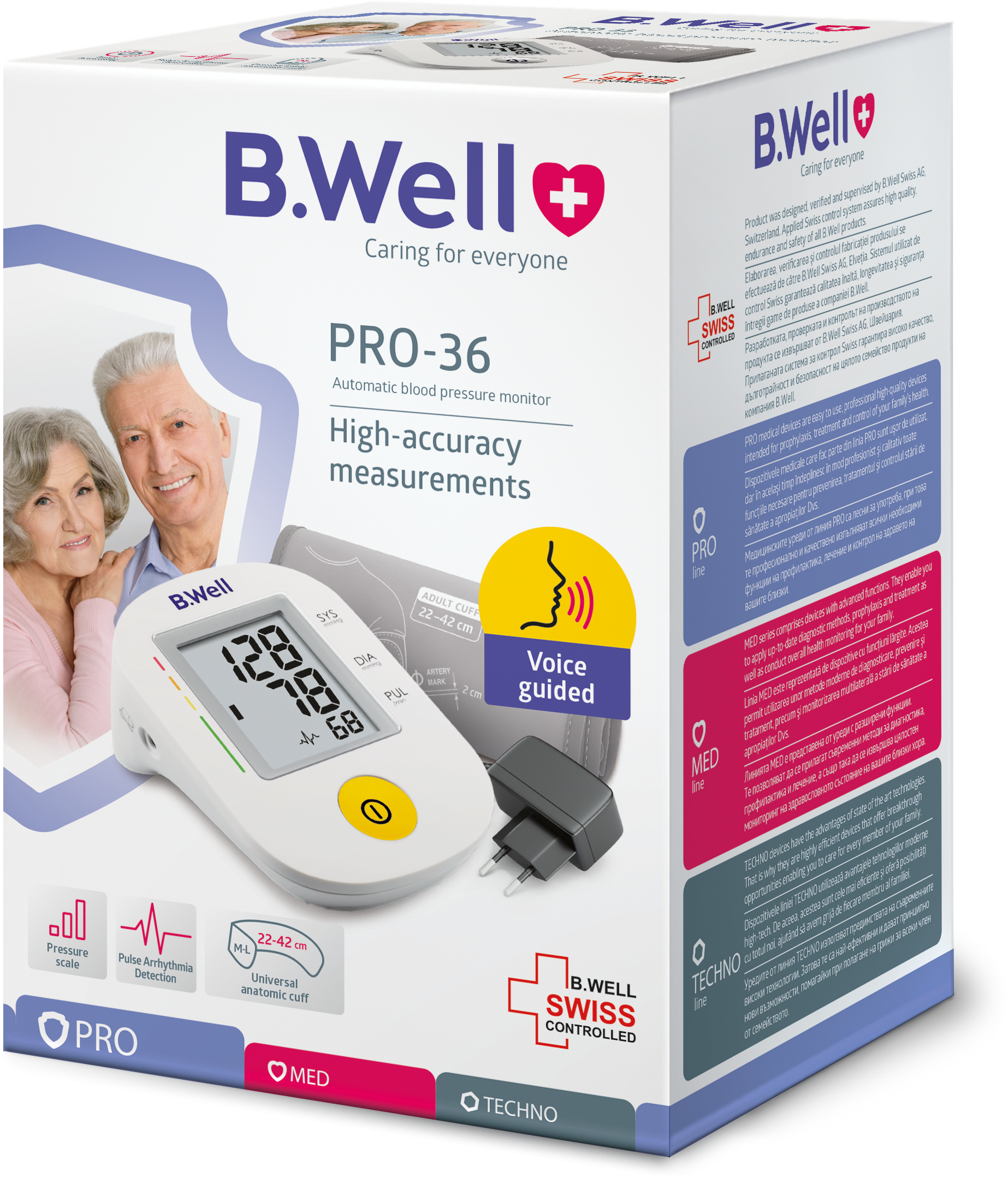 فشارسنج B.Well PRO-36 یک دستگاه فشارسنج دیجیتال بازویی خودکار برای استفاده خانگی و کلینیکی سبک است که توسط شرکت بی ول (B.Well) — برند سوئیسی تجهیزات پزشکی — طراحی و عرضه شده است. این دستگاه بهدلیل قابلیت سخنگو (اعلام صوتی نتایج) برای سالمندان، افراد کمبینا یا نابینا بسیار مناسب است.