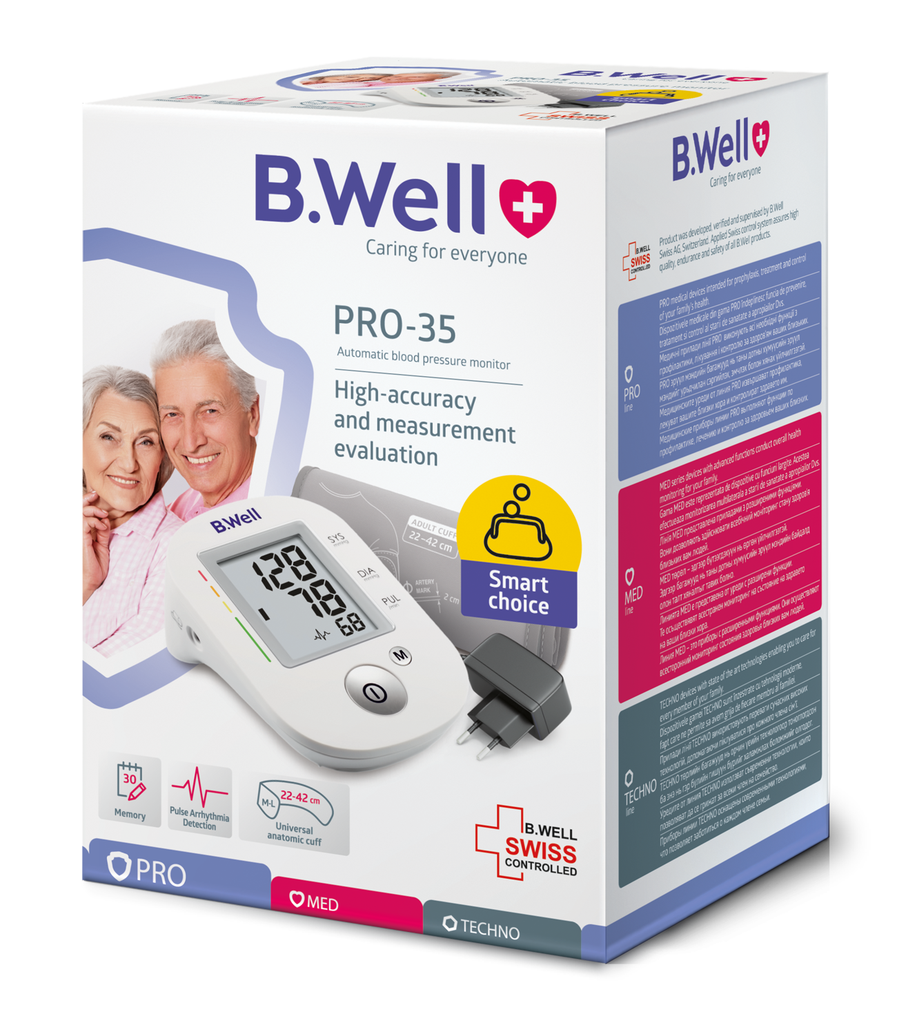 امروز تصمیم گرفتیم فشارسنج دیجیتال بی ول مدل PRO 35 را بررسی کنیم. بستهبندی این محصول به کاملترین شکل ممکن انجام شده است. در جعبهی این محصول یک دستگاه فشارسنج، یک کاف دور بازویی مناسب برای بازوهای 22 تا 42 سانتیمتر، کارت گارانتی، دفترچهی راهنما، 4 باتری نیمقلم و یک آداپتور برق 6 ولتی قرار دارد. استفاده از این دستگاه فشار سنج بسیار آسان است. برای شروع باید باتریها را در قسمت مخصوص قرار دهید یا آداپتور را به دستگاه وصل کرده و به برق بزنید تا منبع انرژی کافی در اختیار دستگاه باشد. سپس کاف بازویی را یک تا 2 سانتیمتر بالاتر از حفرهی آرنج ببندید و دقت کنید که کاف محکم دور بازو بسته نشده باشد. برای اندازهگیری فشار ابتدا روی صندلی بنشینید، آرام باشید و دست خود را به شکلی که کاف هم ارتفاع با قلبتان قرار بگیرد، روی میز قرار دهید. حالا همه چیز برای شروع آماده است و باید فقط دکمهی power روی دستگاه را فشار دهید. بعد از اینکه دستگاه فشار خون شما را اندازه گرفت، عدد فشار خون به همراه عدد ضربان قلب شما روی صفحه نمایش دستگاه اعلام میشود. این فشارسنج تاریخ و ساعت ندارد، حافظهی داخلی آن برای حفظ کردن 30 نتیجه مناسب و تک کاربره است. برای دسترسی به نتایج قبلی فقط باید دکمهی M را بزنید تا با هر بار فشار دادن آن، نتیجههای قبلی را مشاهده کنید. این دستگاه هشدار آریتمی و ناهماهنگی ضربان قلب دارد. همچنین ضعیف بودن باتری را به شما اطلاع میدهد و یک چارت طبقهبندی فشار خون دارد که همهی اینها را روی صفحه نمایش خود به شما نشان میدهد.